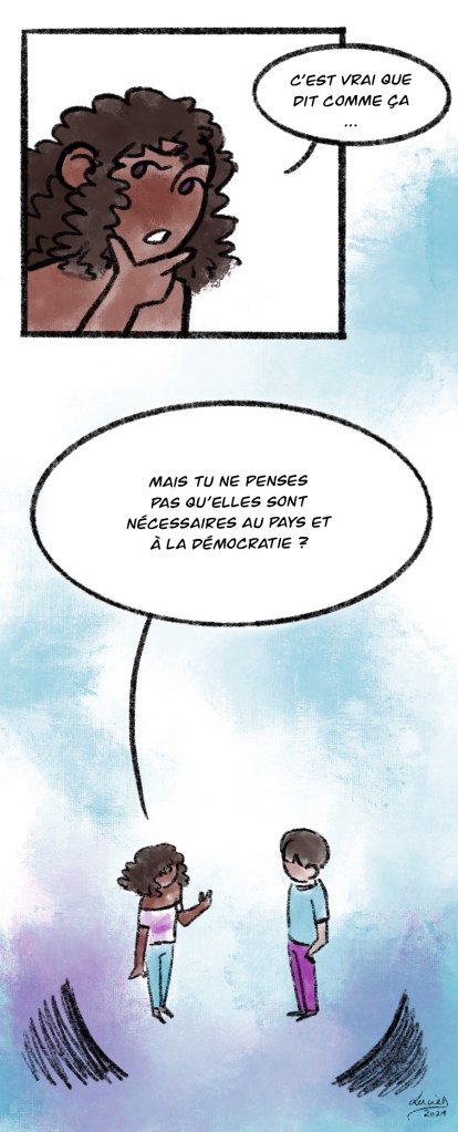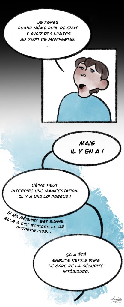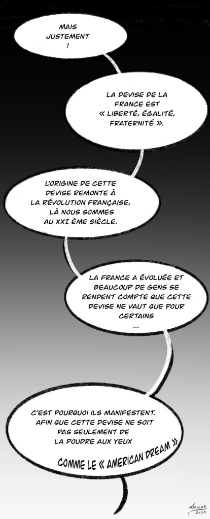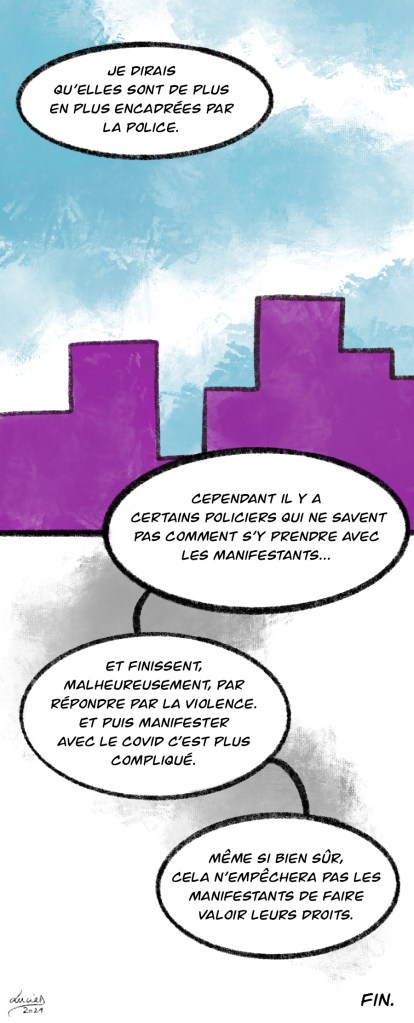 Par le biais d’une courte BD, on verra comment la manifestation a permis au cours du temps au peuple de s’exprimer et de montrer ses opinions au plus de monde, en en faisant quelque chose d’indispensable dans une démocratie, puisque c’est une liberté que certains pays n’ont pas.